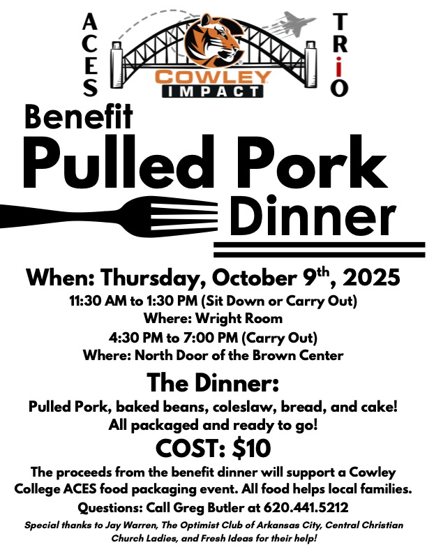 Cowley College ACES (Academic Civic Engagement through Service) invites the community to gather around the table for its annual Pulled Pork Benefit Dinner on Thursday, October 9, 2025. This hometown favorite not only serves a hearty meal but also funds the ACES food packaging project, where students and volunteers will prepare 20,000 meal servings for local food pantries and churches to help families in need.